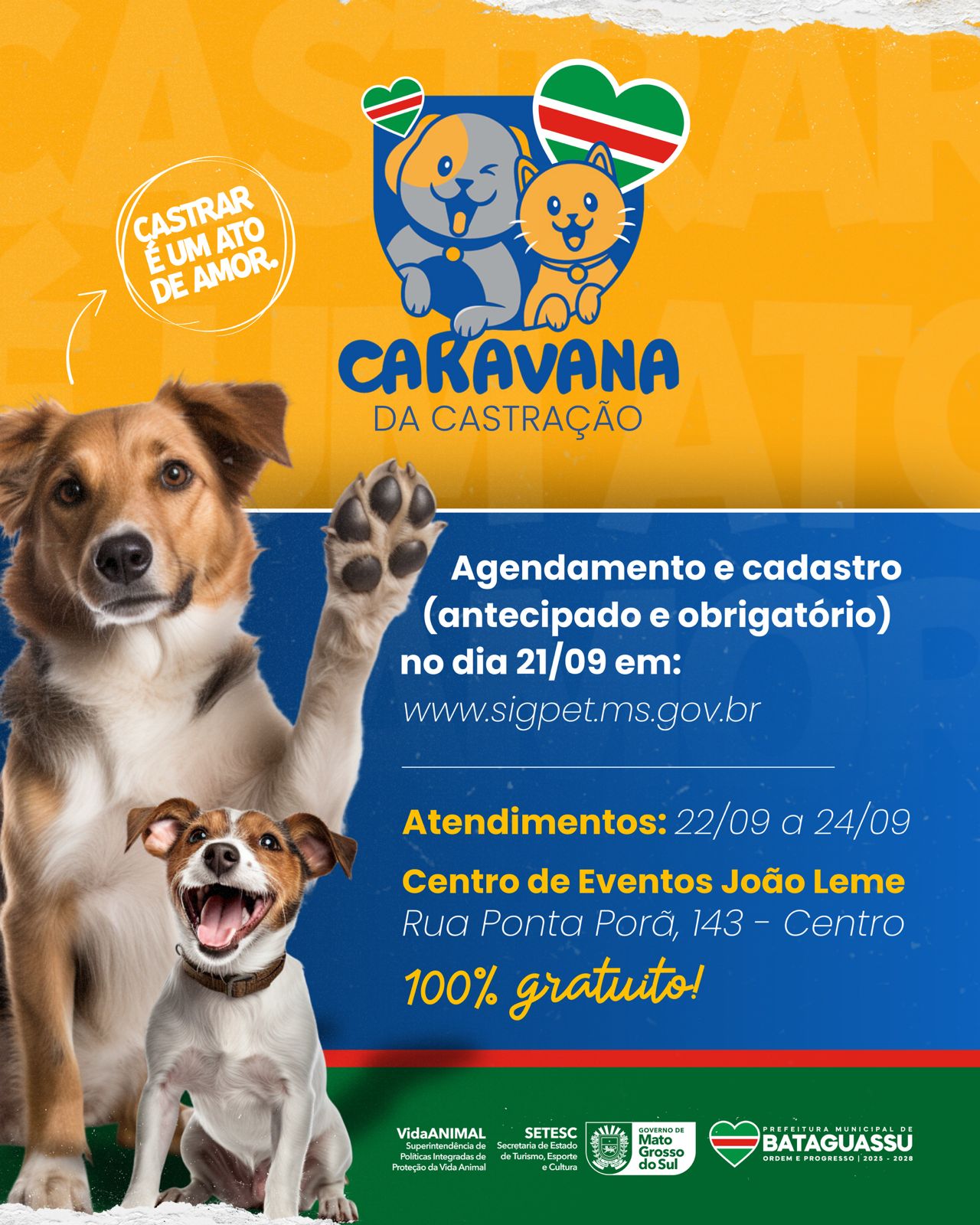 A campanha reforça que "castrar é um ato de amor", destacando a importância da castração como uma medida de cuidado e responsabilidade com os animais. A ação é uma parceria entre a Prefeitura Municipal de Bataguassu e a Caravana da Castração.